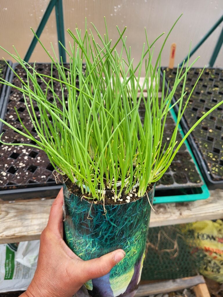 Up-potting using this method does not mean transplanting little starts into transplant pots. It simply means create a new roll and transplant starts into a taller roll. Transplanting seedlings this way saves space for you to continue sowing seeds and up-potting as needed. With that said, I would not up-pot onions, chives, bunching onions, leaks, and smaller seedlings like thyme.