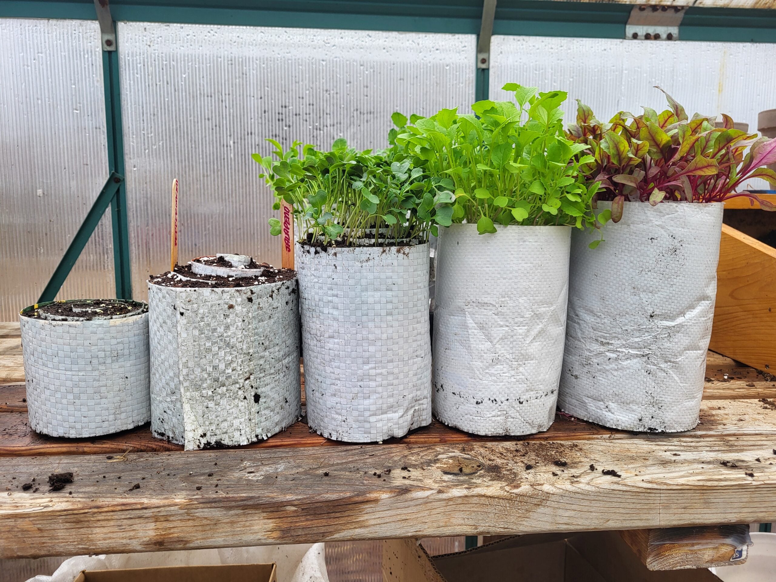 The creator of this seed sowing method states that just about any material can be used. We opted to utilize and recycle feed bags instead of sending them to the landfill. However, I have seen photos of individuals utilizing: